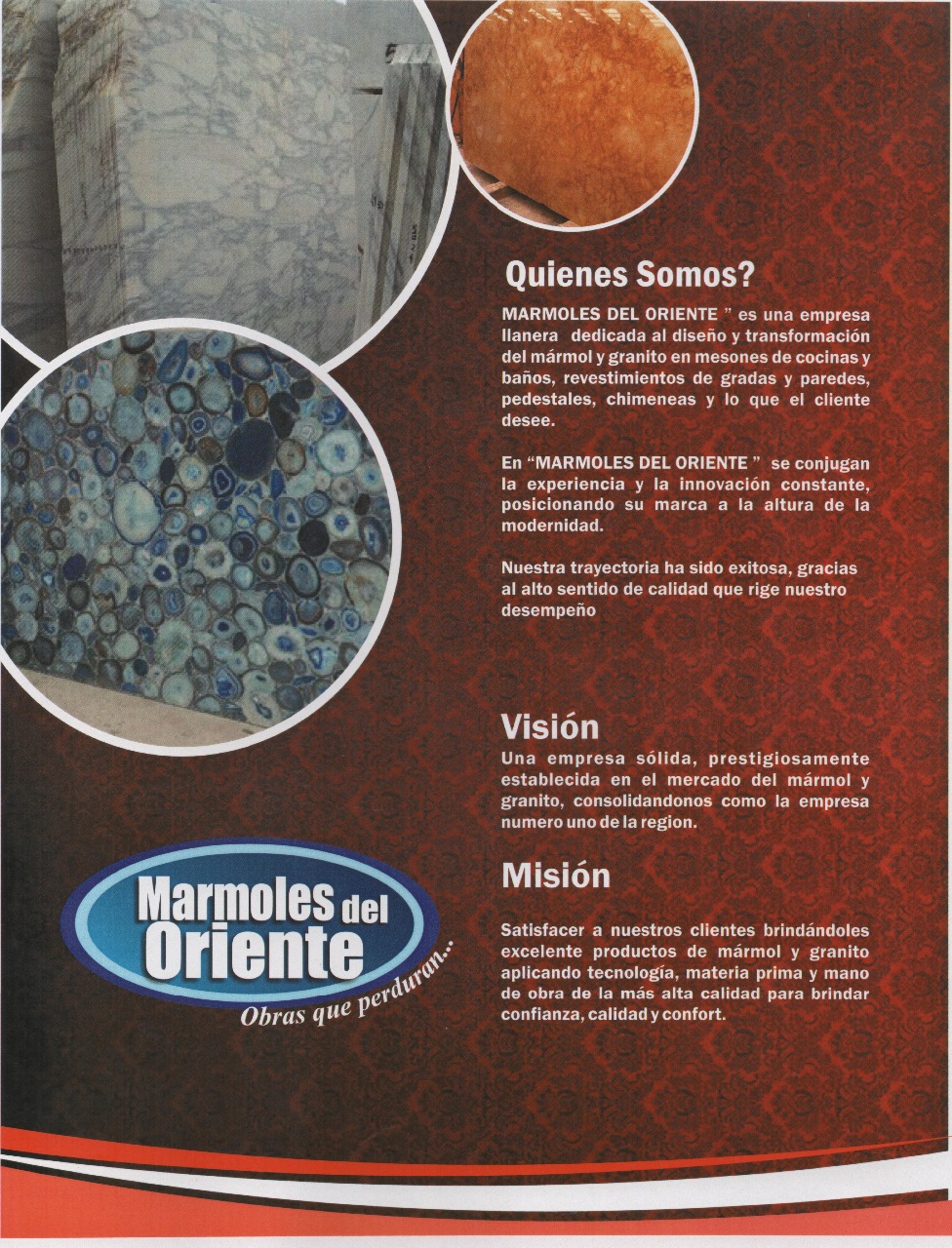 MARMOLES DEL ORIENTE se dedica a la fabricación, comercialización y distribución de obras de Mármol y Granito natural. Elaboración y remodelación de cocinas y baños. Mesones, Enchapes, Pisos, Fachadas, Escaleras. Venta de retales de mármol, griferías, estufas. Asesoría.